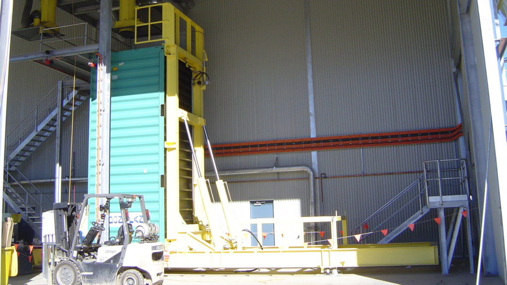 It comes fitted with an automatic door closing system to allow the operator safety at a distance, large twist locks to hold the container in position during filling and a hydraulic power pack.