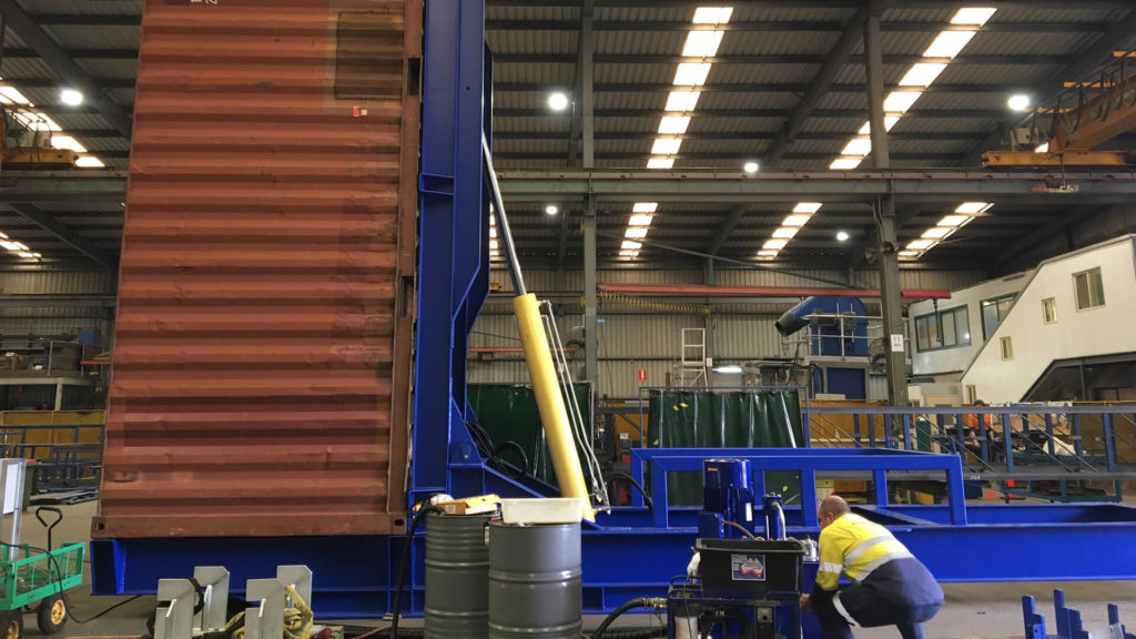 The inverter is operated by hydraulics and lifts the container through ninety degrees.